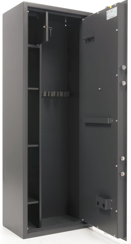 — Сейф делится на две секции: одна оборудована тремя ложементами, во второй расположены съёмные полки и трейзер (запирающееся на ключ отделение для патронов) размерами 222 x 178 x 187 мм.