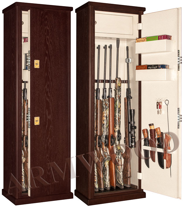 - Внутри сейфа есть запираемое (патронное) отделение и деревянные ложементы на 7 стволов.